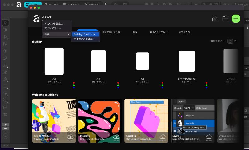 立ち上げ時に出てくるウィンドウにアカウント入力欄がありログインするとCanvaとAffinityのアカウントが紐付きます。立ち上げ時以外にこの画面を表示する方法がない気がしますが立ち上げ激早なのでヨシとします。同志よ何度でも立ち上げれ。(⌘Nつまりは新規作成で出ました。)